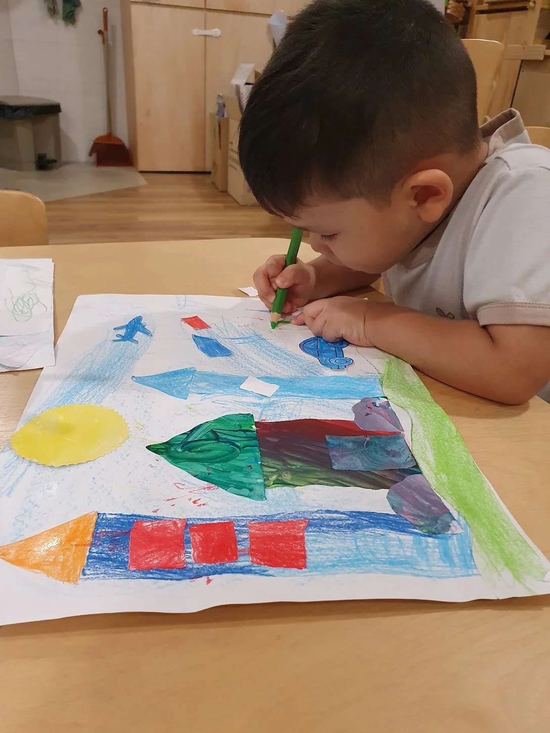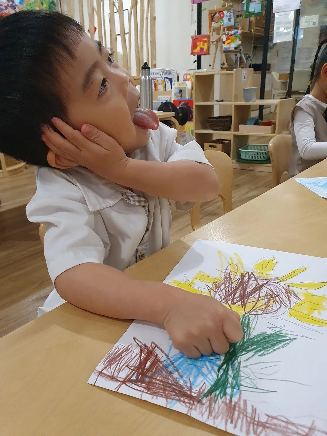 This little guy has his locus of focus on the colouring part, using crayons and colour pencils. Let’s find ours.